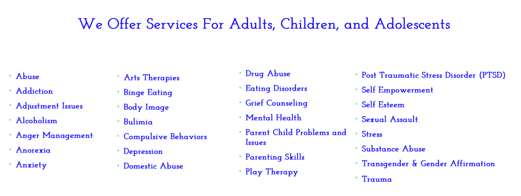 We specialize in Anxiety, Depression, Relationships & Couples Counseling, Addiction, Life Transitions, Trauma, & PTSD.